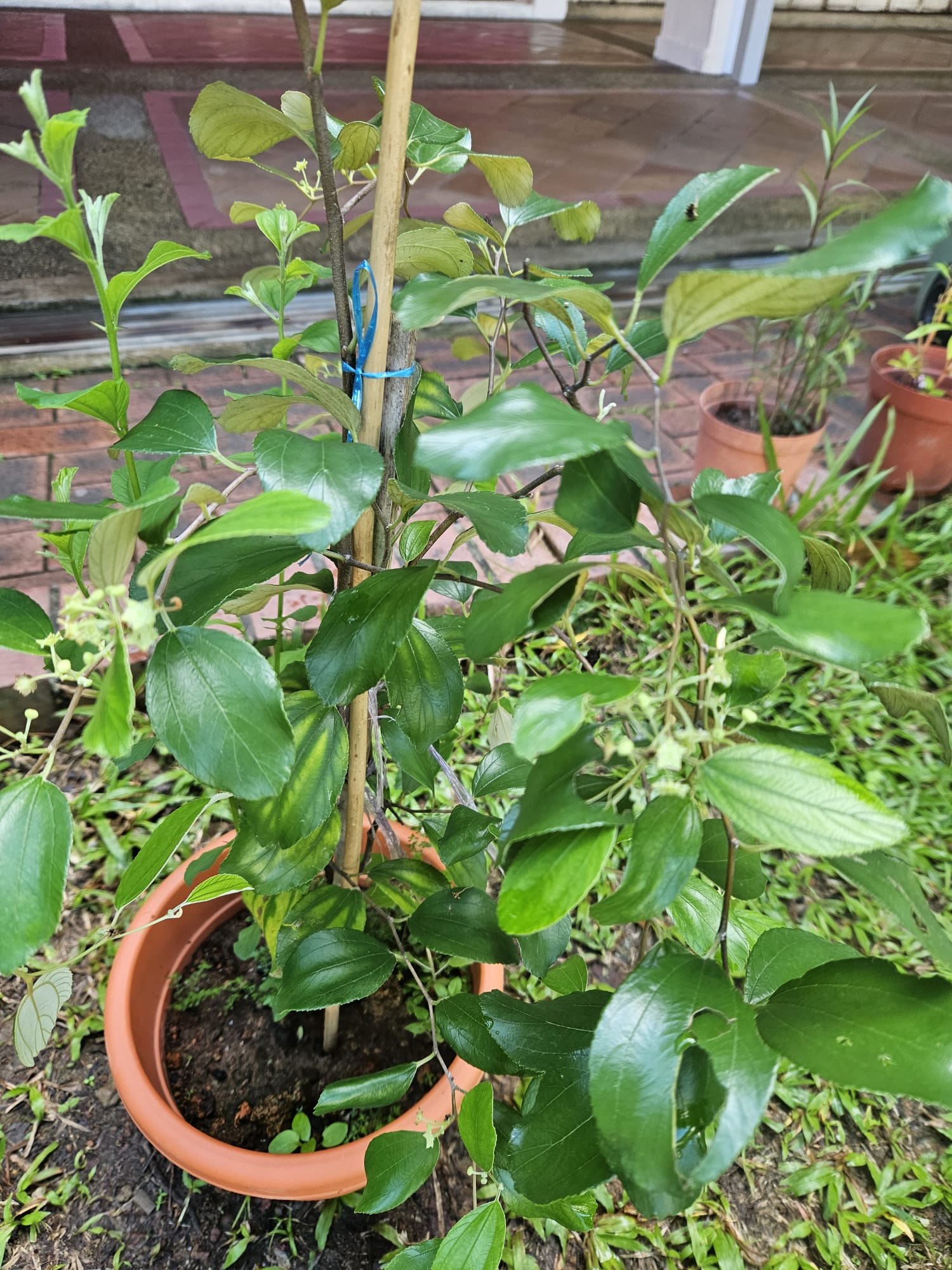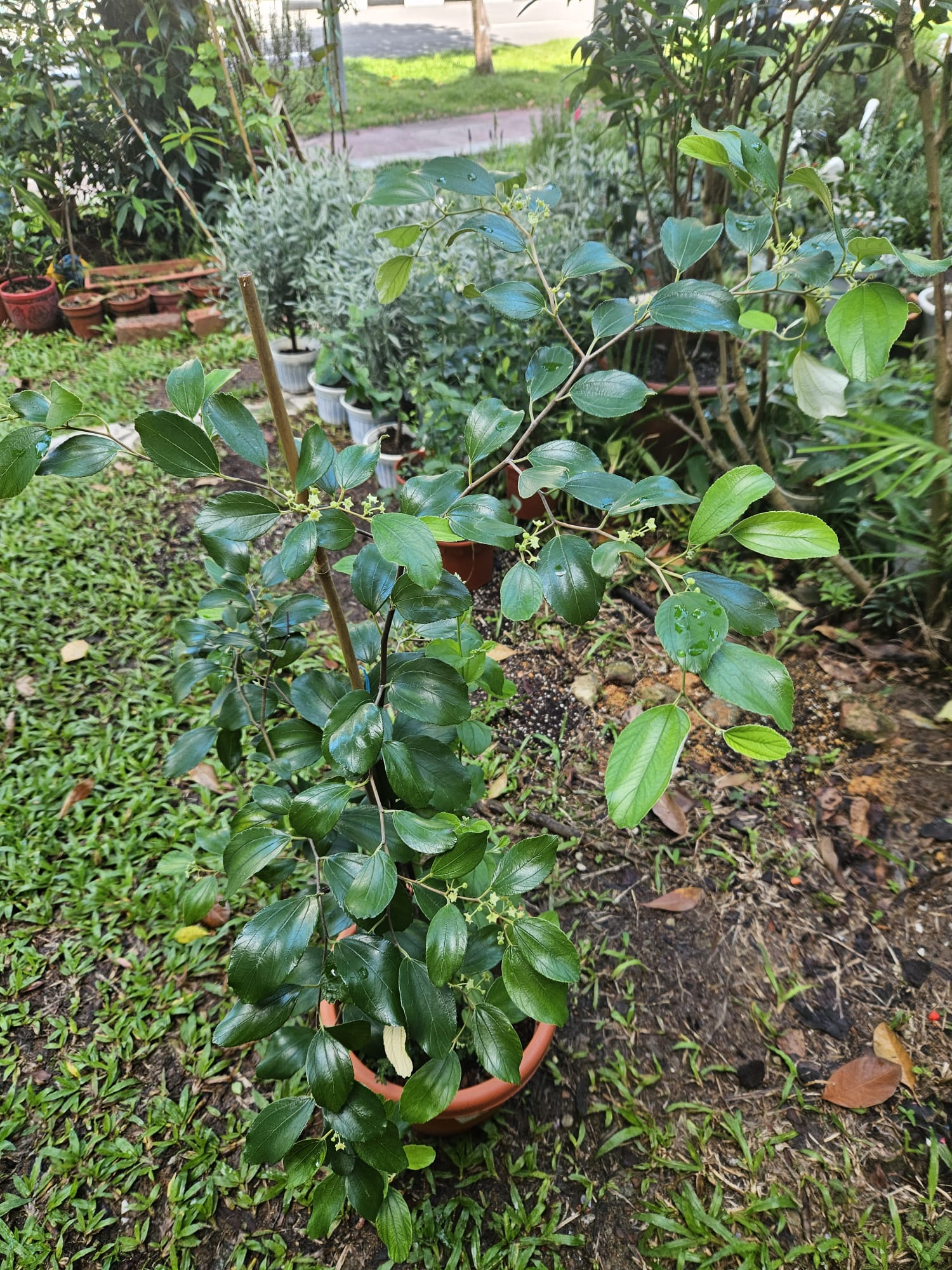 Jujube sapling is about 1.2m tall now. Some are already flowering and fruiting but that is not important because you should remove their flowers and fruits now, if you can! I know a lot of you sayang sayang. Did you know by removing the flowers and fruits now, you give your plant an opportunity to grow properly, focus on their roots, body and stems. It might be slow in the beginning but the yield is sustainable over the long run. Fruits production will increase year after year. Jujube plant can fruit up to 5 years with good quality fruit.